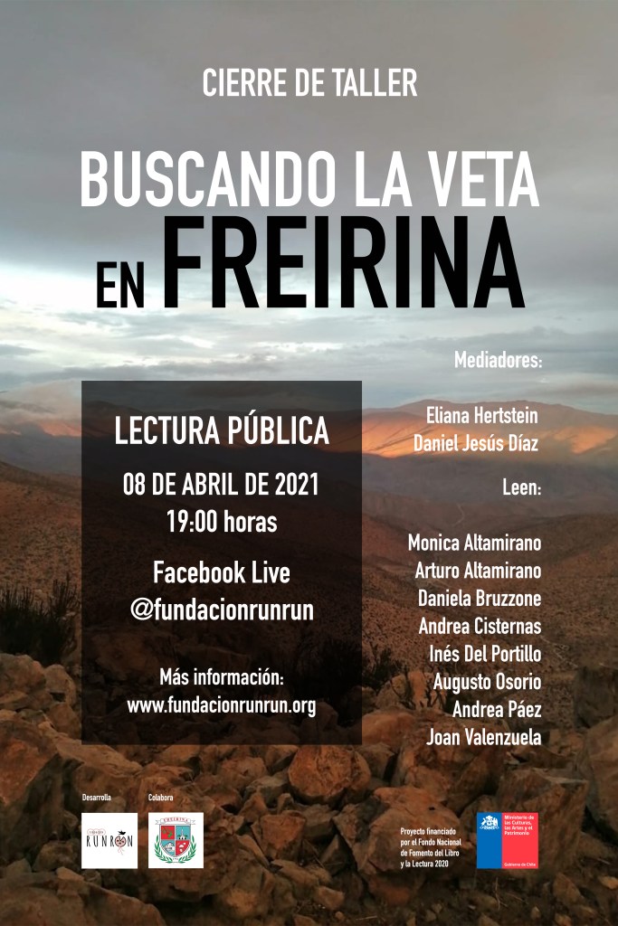 En pleno 2021, aún en pandemia y ad portas de una nueva votación para elegir a los constituyentes que se encargarán de discutir los lineamientos y bases que darán curso a esa tan esperada nueva constitución, como Familia Runrún estamos por cerrar, junto a habitantes de la citada localidad, una etapa también colectiva: el taller «Buscando la veta». Espacio de encuentro participativo, democrático, inclusivo, colaborativo y creativo en torno a la literatura, desarrollado durante tres meses, desde diciembre del 2020 a febrero de 2021.