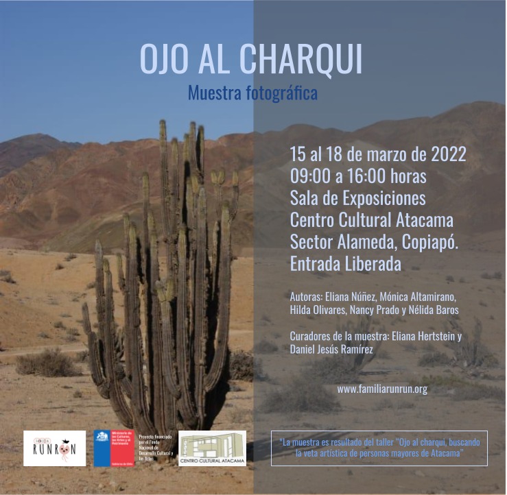 Esto y más estará en la muestra “Ojo al Charqui”. Así lo expresan sus organizadores, quienes adelantan que “quienes visiten la muestra se sorprenderán, pues verán reflejada la región a través de la mirada de cinco mujeres de Atacama”.