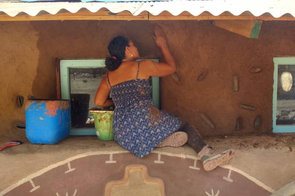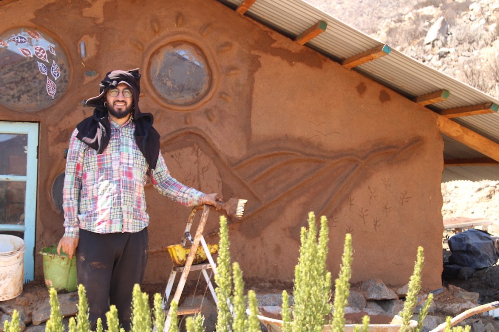 Nosotros nos hemos sumado para apañar con el revoque grueso y fino de las paredes, además de la construcción de un mural que pintamos con pigmentos naturales hechos a partir de tierras de la zona y de Mincha, estas últimas donadas por el tremendo Juan Miguel Tapia, labor en la que también participó en una primera etapa Irene Alvear, cantora y gestora de la biblioteca Irene Azcárate de El Tránsito.