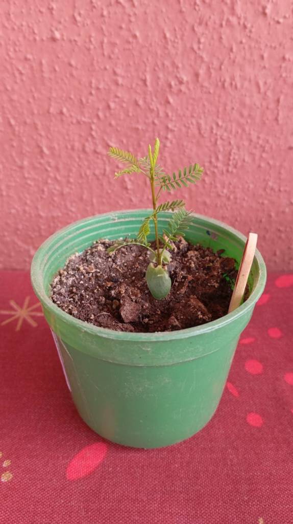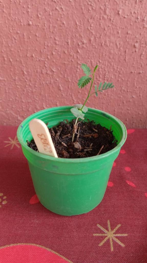 Como una pequeña muestra, aquí un espino (Vachellia Caven) y un algarrobo (Proposis Chilensis), de 2 meses y medio de vida germinados, plantados y cuidados en el vivero móvil: