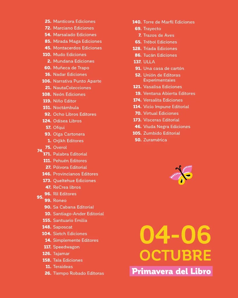 Hoy y mañana participaremos de la 5ª Feria Feminista del Libro, organizada por la Red Feminista del Libro de Coquimbo. A su vez, entre el 4 y el 6 del mismo mes, diremos presente en la 13ª Primavera del Libro, organizada por el gremio Editoriales de Chile. Esta última se desarrollará por primera vez en el Parque Estadio Nacional, en la comuna de Ñuñoa. La instancia contará con la participación de cerca de 200 editoriales del país.