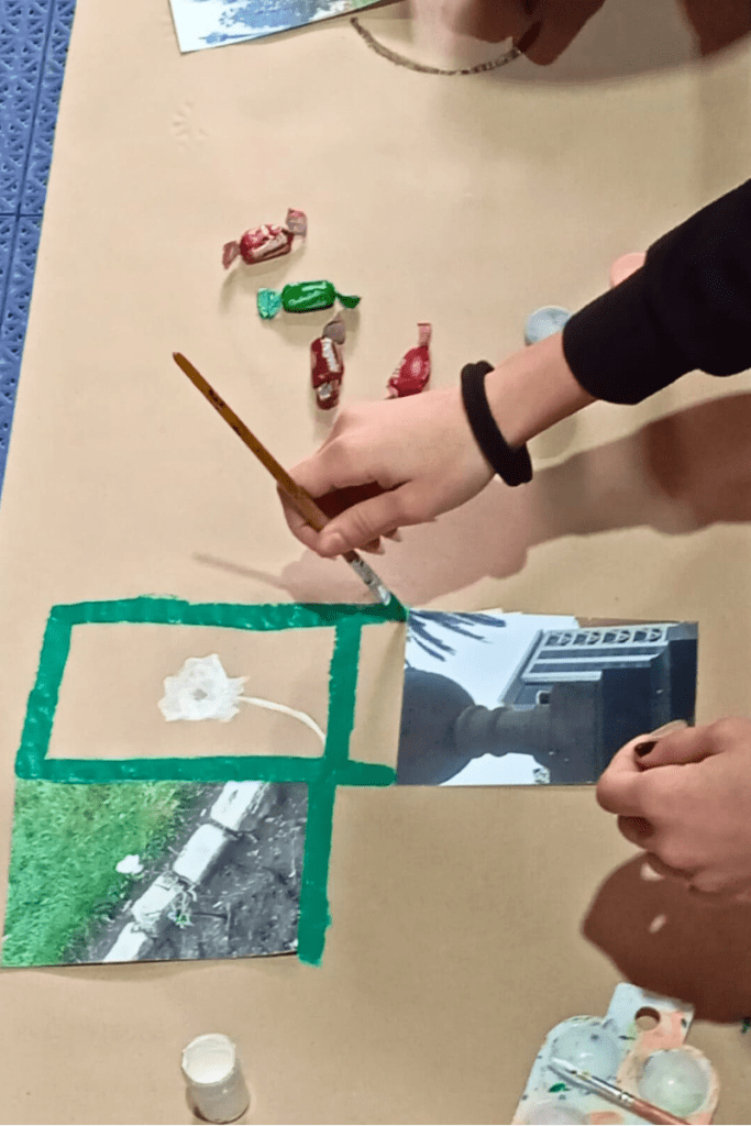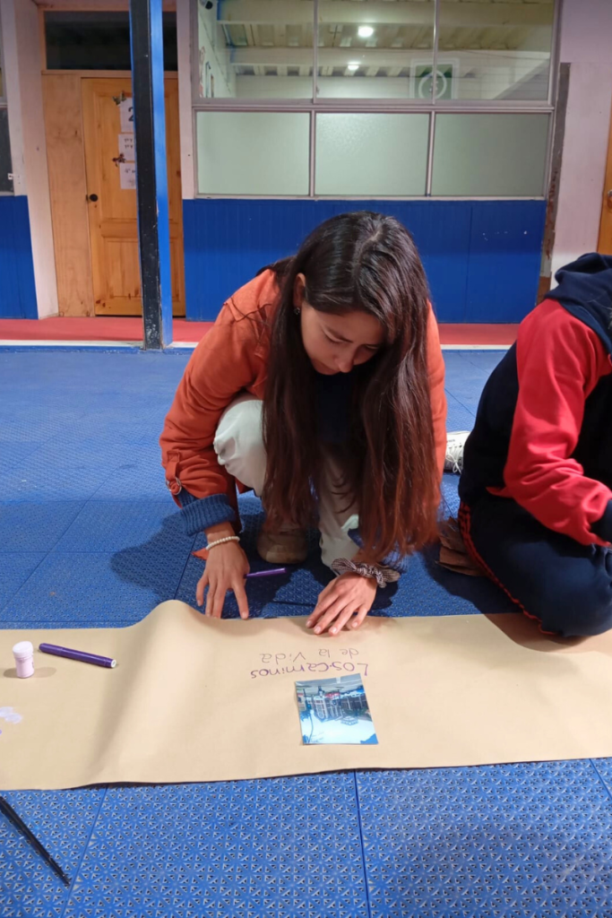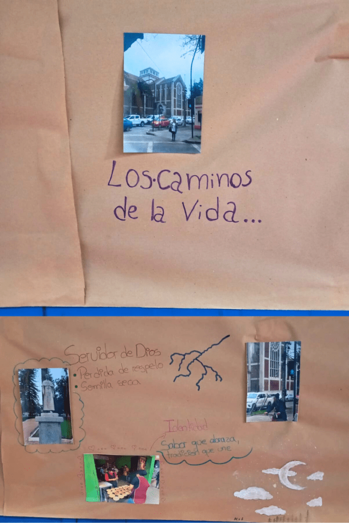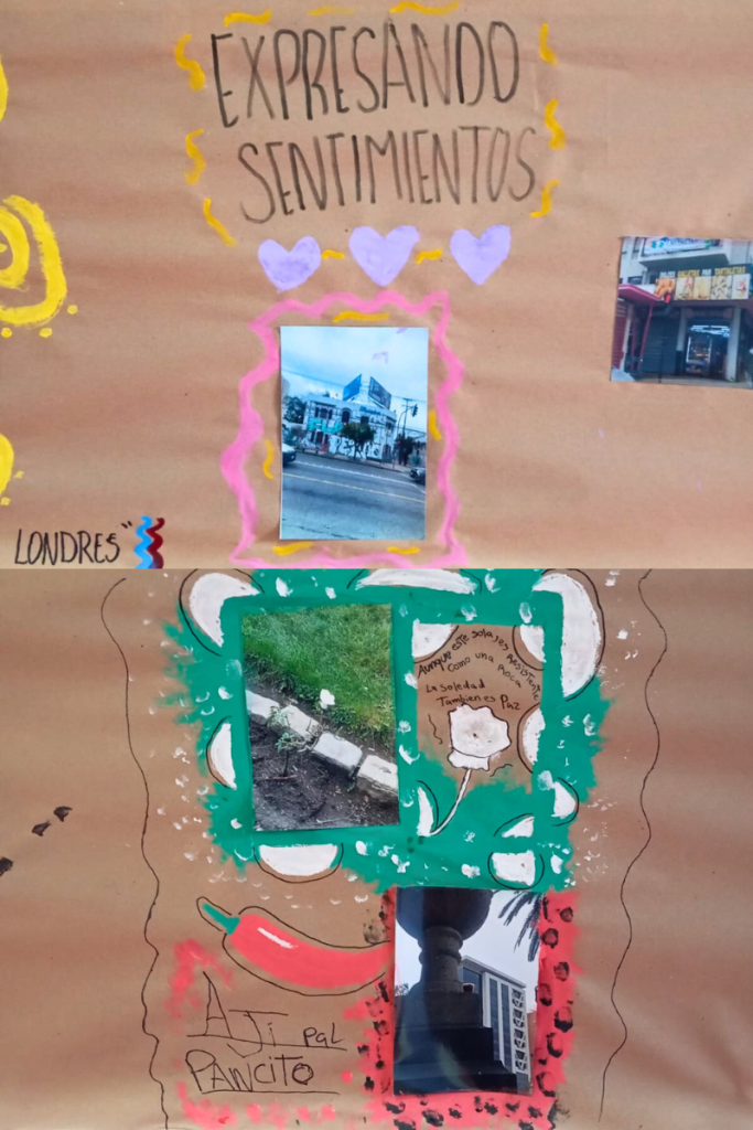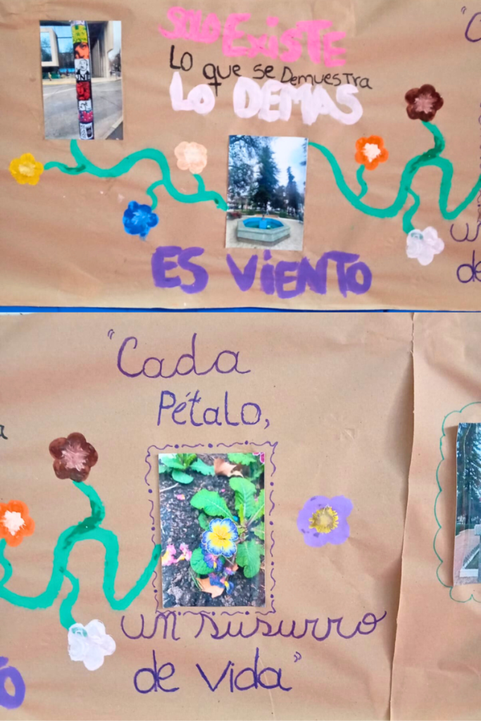 Estas anotaciones inspiraron posteriormente los trabajos creativos finales, que fueron plasmados en un lienzo de papel con fotos de la ciudad tomadas por los propios estudiantes, más algunas palabras que les evocaron dichas imágenes, construyendo así un relato colectivo.