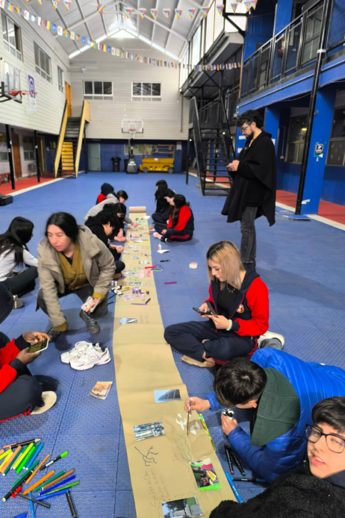 Daniel también estuvo acompañado por Karina Quintana y Sofía Valenzuela, artistas locales invitadas que apoyaron desde lo creativo en el taller, además de la comunidad educativa del Colegio Piaget, a quienes agradecemos que nos abrieran sus puertas.