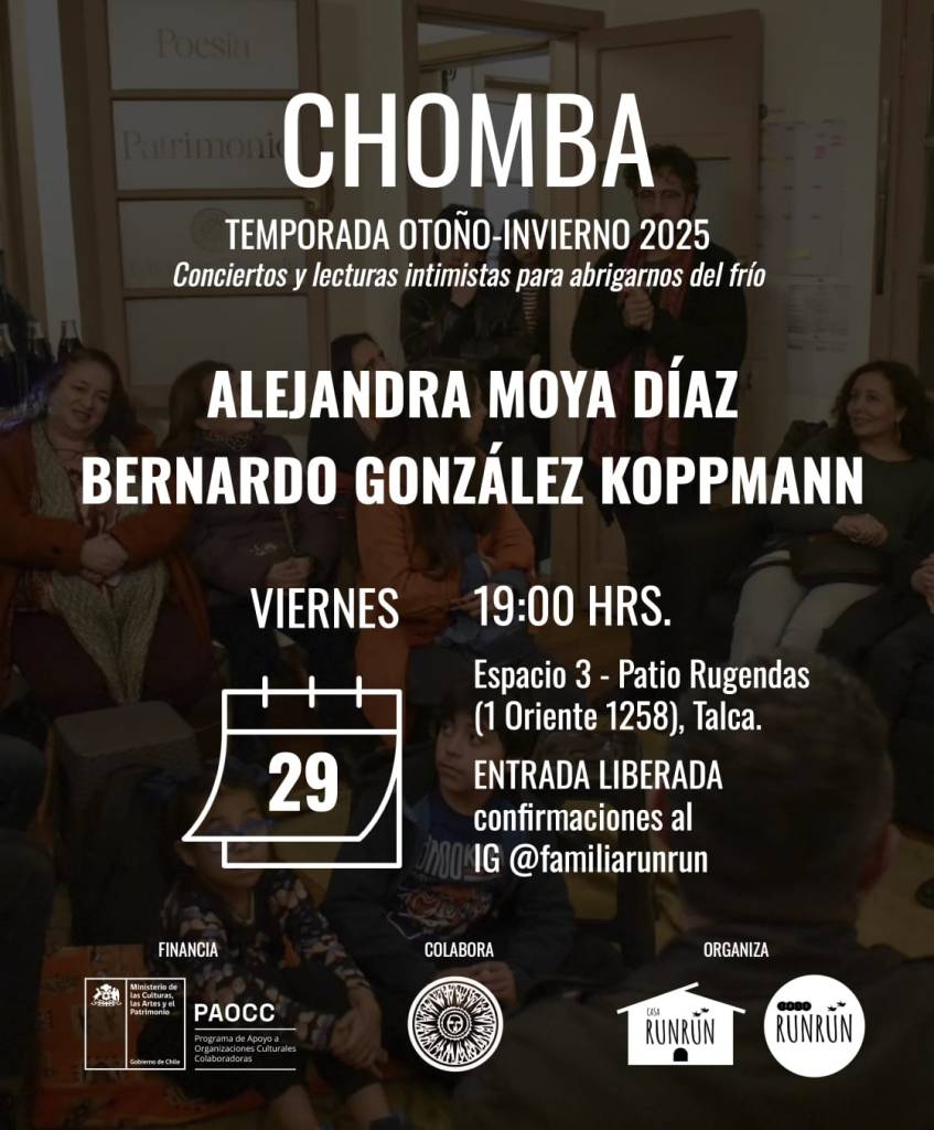 Dos grandes poetas del Maule nos acompañan en la próxima Chomba del año. La cita es para el próximo viernes 29, desde las 19:00 hrs., en Ediciones Filacteria (1 Oriente, 1258, Talca).