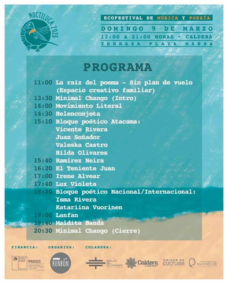 Este año 2025, que corresponde a la segunda versión oficial de Noctiluca, nos concentraremos temáticamente en el AIRE, elemento que nos permite contar con el oxígeno vital, pero además facilita la propagación de los movimientos ondulatorios que luego, en nuestro cerebro, se transforman en sonidos, música y palabras. El 2023 fue el AGUA. La invitación, por tanto, es a escuchar y prestar atención a lo que está en el aire o sobre este, incluso más allá de la atmósfera terrestre: las nubes, la lluvia, la camanchaca, los vientos, las aves, los fenómenos estelares, la minería espacial, la vida extraterrestre, incluso alguna deidad. Por eso, Noctiluca tiene como símbolo para esta nueva versión a un «Chincol», ave de vasta presencia en prácticamente todo el país además de otras zonas de Suramérica, ligada a varias oralidades, entre ellas el mito sobre su canto que indicaría un llamado de ayuda. «Han visto a mi tío Agustín», cuentan que exclama, en alusión a una lesión sufrida en un partido de chueca que lo dejó cojo y dando saltitos como en una pata. Su tío sería un curandero, de ahí el trinar incesante para encontrarlo. Este Noctiluca, entonces, estará cargado al cielo como una invitación abierta a mirar hacia arriba, como un llamado auxiliador para encontrarnos, escuchar y hacer una pausa reflexiva en nuestras vidas aceleradas, dándole el valor a la oralidad, a la conversación hablada que se transmite como vibraciones que llegan a nuestros oídos, se transforman en sonidos con significado, y luego en relatos como fuentes de sabiduría inagotable y necesaria para hacer comunidad.
